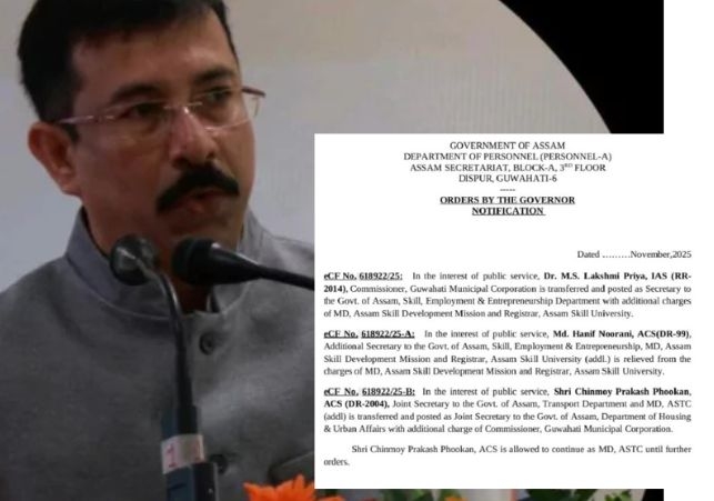 According to the same announcement, GMC Commissioner Dr. M.S. Lakshmi Priya has been moved and appointed Secretary to the Government of Assam in the Department of Skills, Employment, and Entrepreneurship.