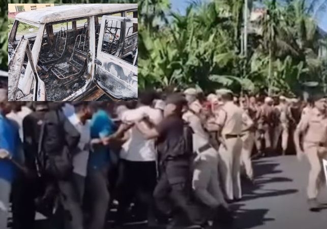 The vehicle sustained damage after protesters pelted stones. In the face of mounting aggression, police were forced to respond with tear gas and a baton charge to bring the situation under control.